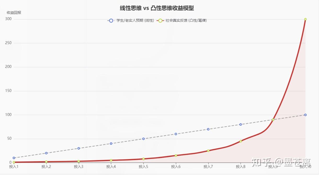 学校的投入产出是线性的(Linear):y = kx(努力=分数)。 社会的投入产出是幂律的(Power Law):大部分努力是无效的噪音,极少数的关键决策带来了绝大部分收益。